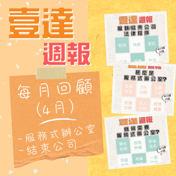 四月份的周報中,我們談到了兩個重要的話題:(1)服務式辦公室,(2)撤銷公司/結束公司、商標註冊。這次的每月回顧我們會總結一些服務式辦公室的重點,和撤銷公司、商標註冊的簡介,讓大家好好做準備!