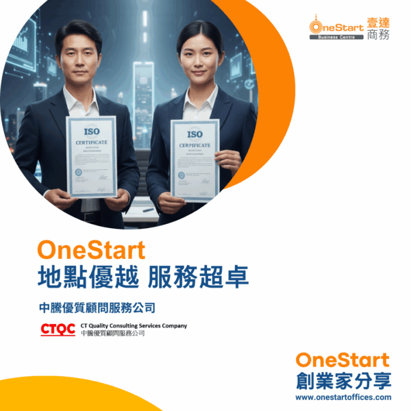 今期 OneStart 的客戶專訪,我們很高興邀請到入駐我們商務中心的中騰優質顧問服務公司。擁有超過 20 年行業經驗的他們,將打破「大公司才做 ISO」的迷思,分享如何透過專業顧問服務,協助初創企業100%獲得認證,並解構他們為何選擇 OneStart 作為業務發展的基地。